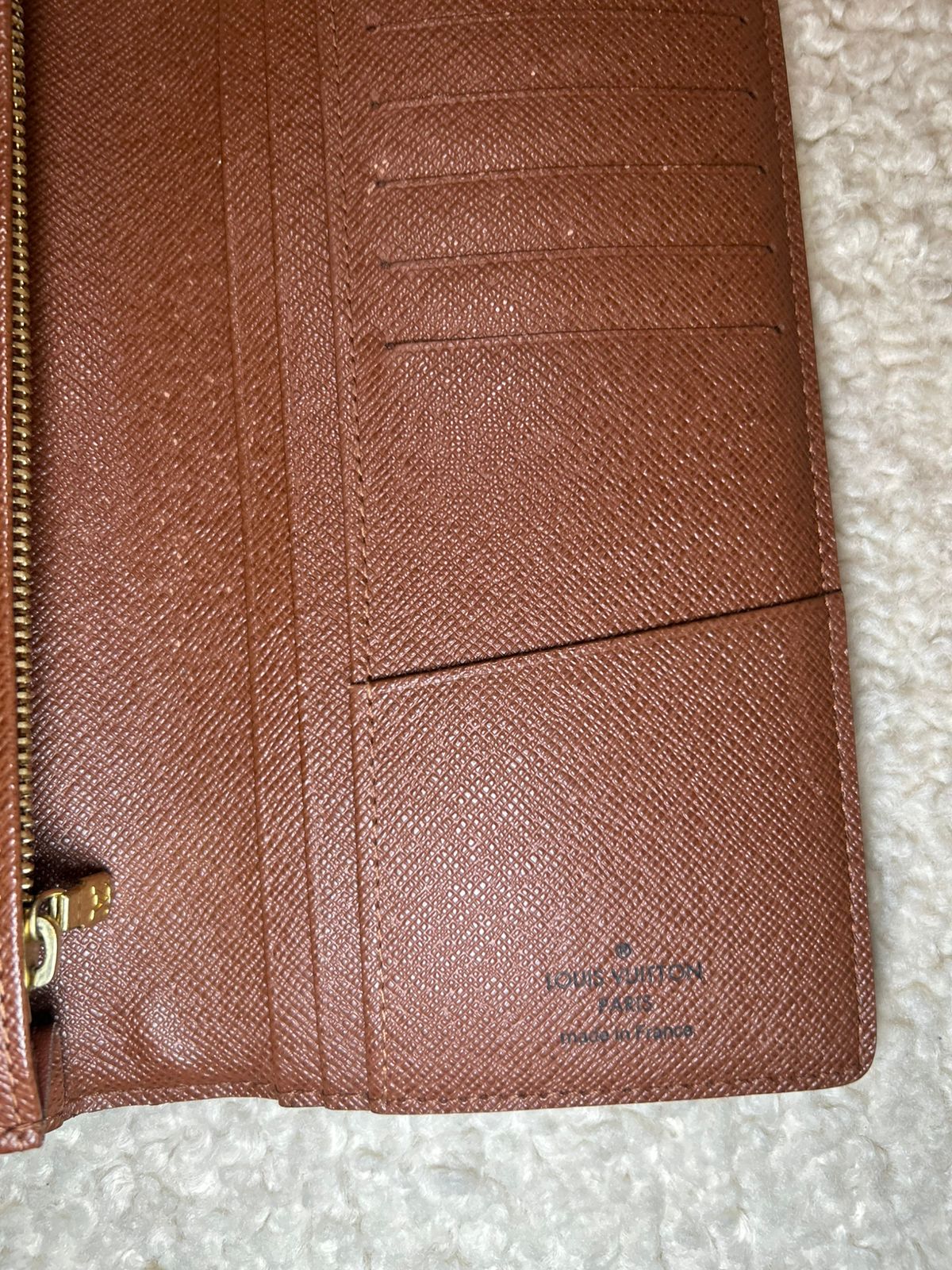 Even patina, visible watermarks, scuffing, and creasing on leather trim, minor scuffing on hardware.