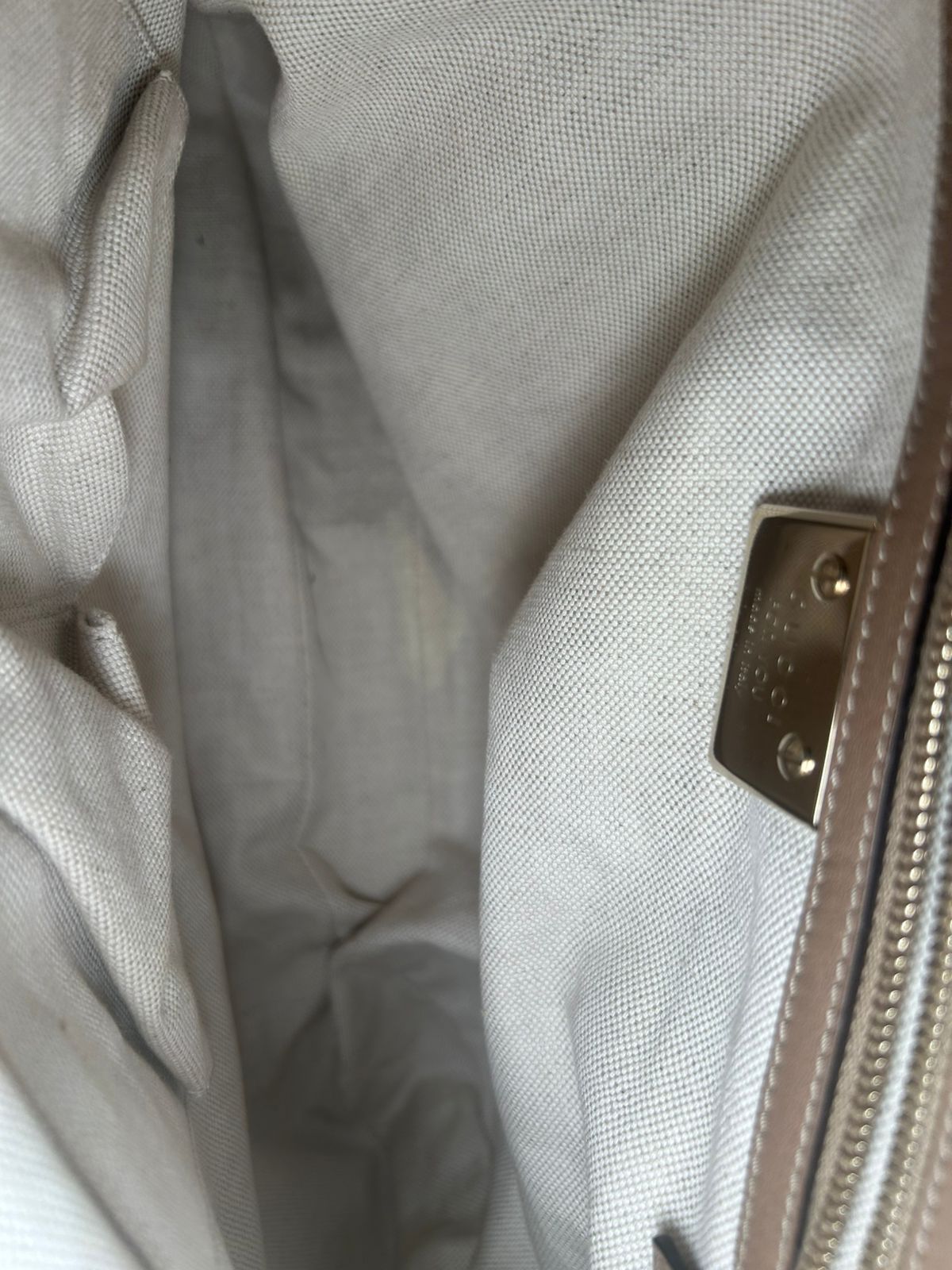 Even patina, visible watermarks, scuffing, and creasing on leather trim, minor scuffing on hardware.