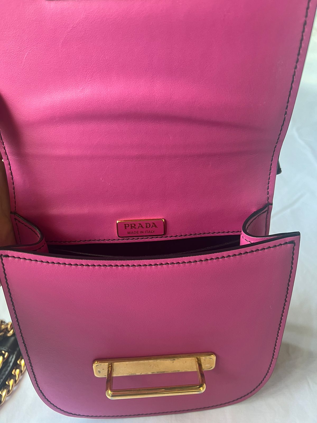 Even patina, visible watermarks, scuffing, and creasing on leather trim, minor scuffing on hardware.